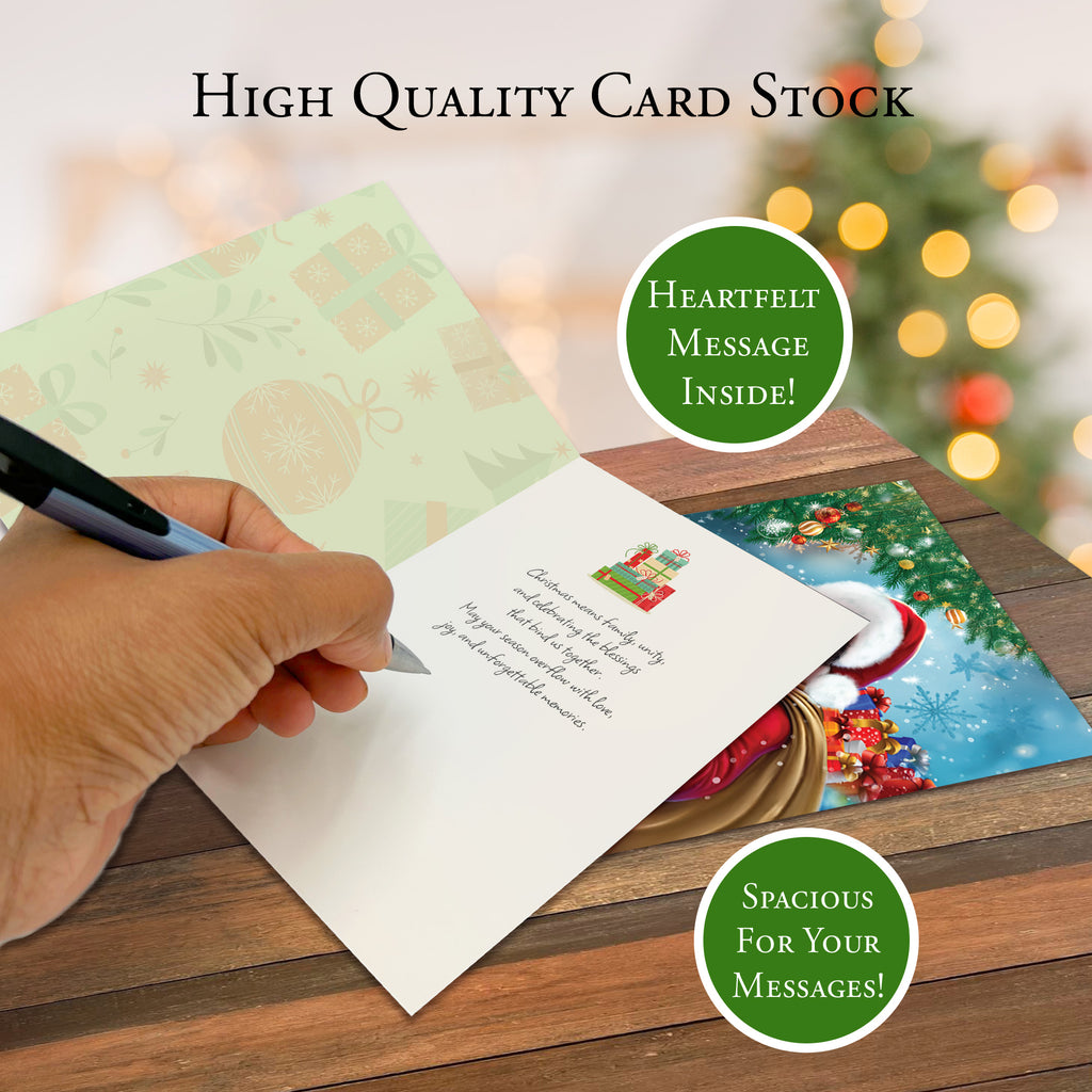Foil-Stamped Christmas Greeting Cards Box SetAfrican American Expressions Christmas cards celebrate the joy of the holidays and the vibrancy of African-American culture! Our collection of thoughtful seasonal greeting card designs feature faith-inspiring inscriptions and culturally reflective artwork gorgeously embellished with foil-stamping. With over 20 thoughtful designs to choose from, whether timeless, traditional, or modern, you're sure to find the perfect card for everyone on your list!Designed with quality craftsmanship. Every 5 x7" greeting card features a high-resolution image, printed onto sturdy card stock, and brilliantly embossed. You'll enjoy sharing these elegant and uplifting cards with your loved ones!Holidays, SimplifiedEverything you need to be holiday-ready in one box! AAE's boxed sets include 15 gorgeous greeting cards with coordinating foil-lined envelopes and gold sticker seals. Just personalize, seal, and deliver!FeaturesInspirational Christmas Cards5 x 7"Boxed Set15 Embossed Greeting CardsCoordinating Foil-Lined EnvelopesGold Sticker SealsAbout UsAfrican American Expressions is the world’s largest black-owned gift and greeting-card company. Known for eye-catching designs and poignant art pieces, we offer the top selection of culturally authentic gifts and give back to the community through the AAE fundraising program.