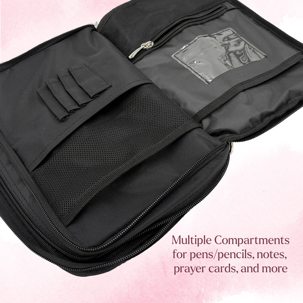 • MULTI-FUNCTION ORGANIZER: Each Bible Cover also acts as a great way to organize your miscellaneous items so that you're always prepared for fellowship or Sunday Sermon. Comes with | MAIN LARGE ZIPPERED COMPARTMENT FOR BIBLE OR LARGE BOOK | SECONDARY ZIPPERED COMPARTMENT WITH SMALL ZIPPERED POUCH FOR LOOSE ITEMS | 3 OTHER SEPARATE POUCHES FOR POST-ITS, NOTES, WITNESS CARDS, SERMON NOTES, PAPER, PRAYER CARDS | ONE CARD SLOT AND | FOUR PEN/PENCIL/HIGHLIGHTER SLOTS
